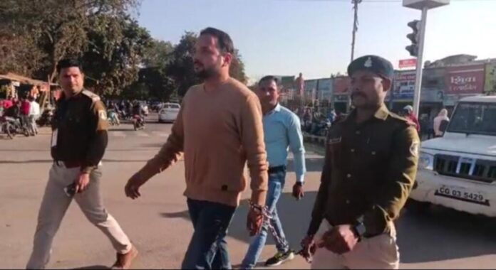 कोरबा (pnews24) कोरबा जिला पुलिस ने कोरबा के पत्रकार पर हमला करने के आरोप में एक व्यक्ति को गिरफ्तार किया हैं। पुलिस के द्वारा उक्त कथित आरोपी बदमाश शैलेश झा का जुलूस भी निकाला। लोगो ने पुलिस के द्वारा की गयी इस कार्यवाही की सराहना की हैं। पुलिस ने कहा हैं कि एम.पी. नगर में आतंक का पर्याय बन रहे अन्य आरोपित व्यक्तियो को भी जल्द ही गिरफ्तार कर लिया जाएगा अन्य कथित आरोपीयो की पुलिस के द्वारा सरगर्मी से तलाश जारी हैं।